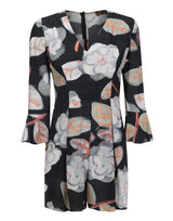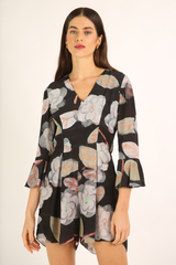 Macaquinho em crepe de seda, modelagem acinturada, mangas 7/8 sino e decote V.