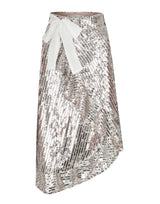 Saia midi ranspassada em paete Kika Simonsen. Modelagem assimétrica com fechamento por colchete. Possui detalhe de babado e faixa fixa para amarração. Detalhe de amarração na cintura em seda.