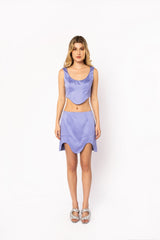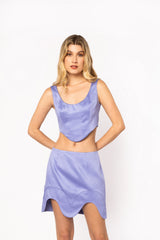 Saia curta alfaiataria, com design arredondado na barra da frente e fechamento lateral com zíper.