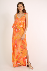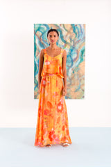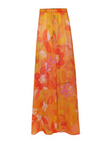 Saia longa em tecido misto de modal com seda estampado, cós com elástico e fenda frontal
