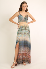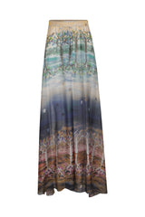 Saia longa em tecido misto de modal com seda estampado, cós com elástico e fenda frontal