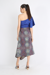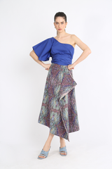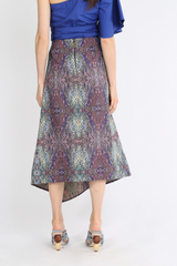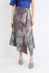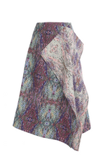 Saia de comprimento midi, confeccionado em jacquard reciclado com desenho exclusivo, possui modelagem mais ampla e design diferenciado, que permite brincar com o avesso do tecido.