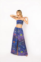 Saia longa estampada, com shape amplo, fenda total no centro frente e shorts interno do prórpio tecido.