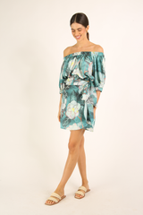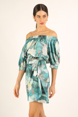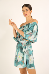 Saia modelagem pareô, comprimento curto, confeccionada em tecido de modal estampado.