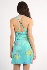 Saia modelagem pareô, comprimento curto, confeccionada em tecido de modal estampado.