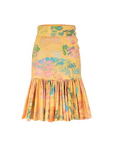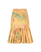 Saia de algodão com elastano estampa exlcusiva Kika Simonsen. Botões na lateral da cintura forrados do próprio tecido. Recorte abaixo do quadril com barrado franzido.