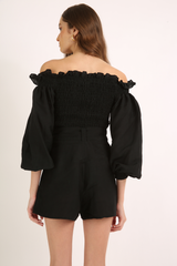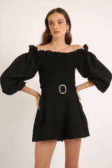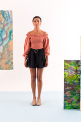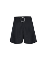 Shorts de alfaiataria em tecido misto de linha com pregas frontais e bolso laterais. Acompanha cinto do próprio tecido com fivela em resina