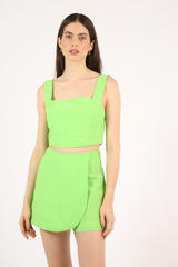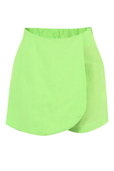 Shorts saia cintura alta, cós traseiro com elástico, confeccionado em linho.