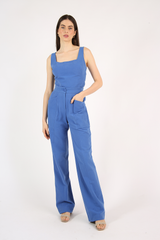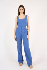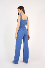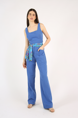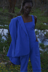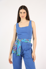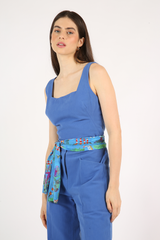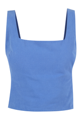 Top de alças com fechamento por zíper traseiro, confeccionado em sarja de algodão reciclado de aparas têxteis.