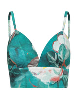Top estilo bustiê em tecido modal estampado, com alças reguláveis por aselhas.
