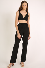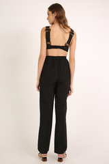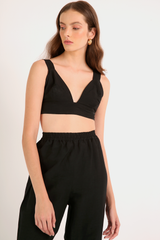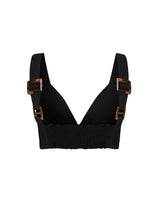Top estilo bustiê confeccionado em tecido misto de linho com alças reguláveis com fivelas de resina e detalhes de lastex nas cotas para melhor ajuste ao corpo