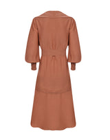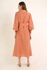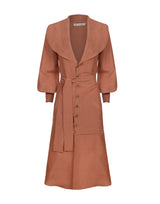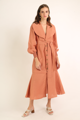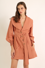 Casaco confeccionado em tecido misto de linho com abotoamento frontal e parte inferior removível, permitindo alterar seu comprimento. Acompanha faixa do próprio tecido.