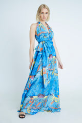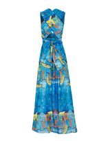 Vestido longo de linho misto Kika Simonsen. Estampa exclusiva Caraiva Noite.