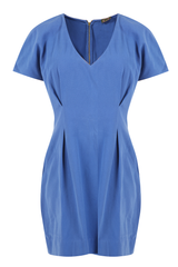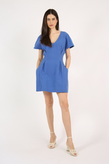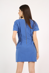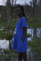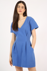 Vestido com mangas, bolsos e pregas frontais, fechamento por zíper nas costas, confeccionado em sarja de algodão reciclado de aparas têxteis.