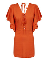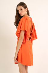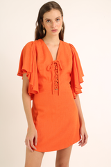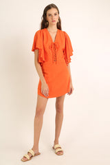 Vestido curto em tecido misto de linho com mangas volumosas, com fechamento ajustável no decote frontal e decote nas costas