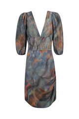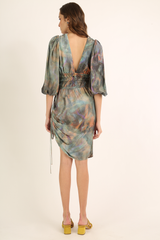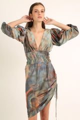 Vestido curto com mangas 3/4 confeccionado com tecido misto de viscose, linho e seda com decote profundo, detalhe franzido com elásticos e canaleta em uma lateral para ajuste de comprimento