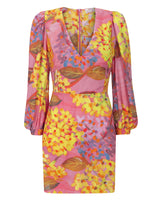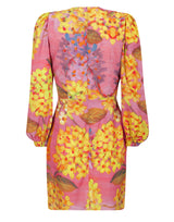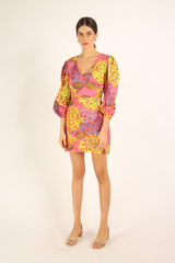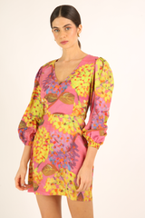 Vestido com mangas longas, confeccionado em tecido biodegradável misto de poliamida com seda, decote V, fechamento por zíper nas costas