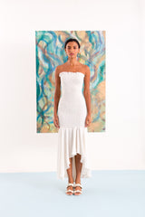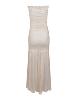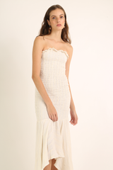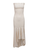 Vestido midi sem alça em tecido de viscose com fios de lurex dourado e corpo em lástex com barra assimétrica