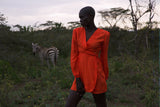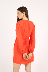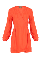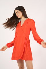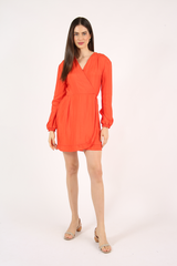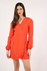 Vestido curto com mangas longas, elástico nos punhos, fechamento por transpasse, confeccionado em tecido de viscose maquinetada.