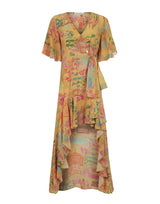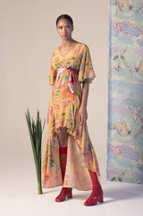 Vestido mullet com babados na barra. Estampa exclusiva Kika Simonsen. Mangas levemente godês. Acompanha laço do mesmo tecido para acinturar peça ao corpo.