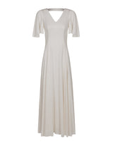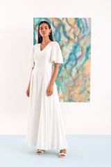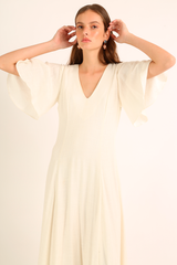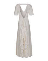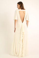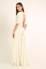 Vestido longo em tecido misto de linho com decote profundo e detalhe de babados nas costas