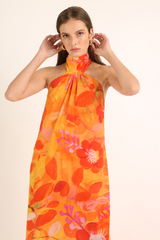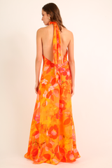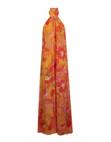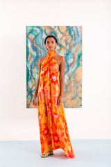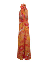 Vestido longo frente única em crepe de seda estampado com faixa na gola amarração