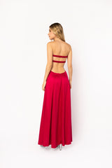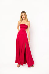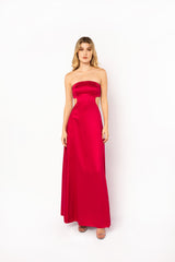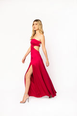 Vestido longo tomara que caia, com vazado e fendas laterais e elástico nas costas. Confeccionado em tecido de alfaitaria.