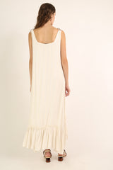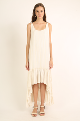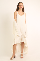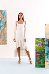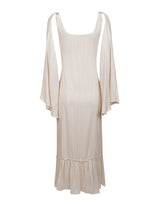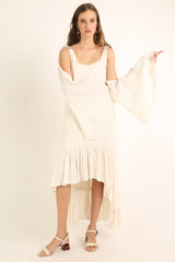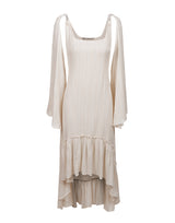 Vestido midi com mangas removíveis em tecido de viscose com fios de lurex dourado e barra assimétrica