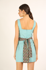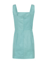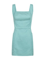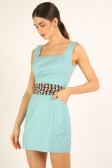 Vestido em tecido misto de algodão, modelagem acinturada, bolsos frontais e fechamento posterior por zíper