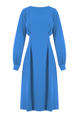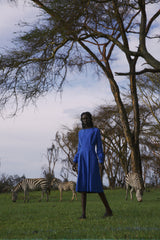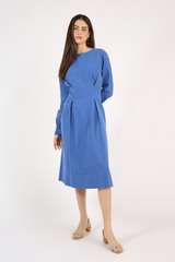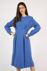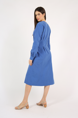 Vestido com mangas longas, bolsos e pregas frontais, fechamento por zíper nas costas, confeccionado em sarja de algodão reciclado de aparas têxteis.