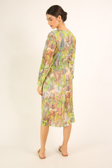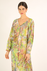 As pinceladas de característica única da designer, saem de suas telas, elaboradas em diversas camadas de tinta acrílica dentro de seu atelier. Essas pinceladas, posteriormente, se transformam em estampas exclusivas e atemporais a cada coleção, mantendo uma estética refinada e o processo de criação artsy na sua mais pura essência.