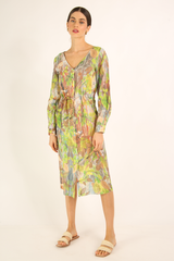 Vestido midi em tecido de linho, abotoamento frontal e cintura regulável com rolotê