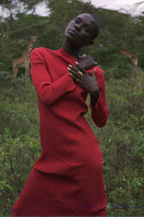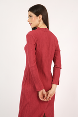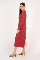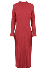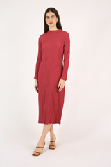Vestido modelagem ajustada ao corpo, com mangas longas e fendas laterais, confeccionado em tecido anarruga de modal.