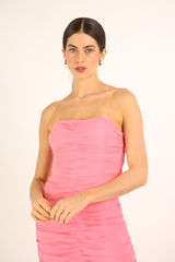 Vestido confeccionado em crepe georgete de viscose, forrado, drapeado, com alças removíveis.