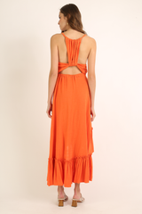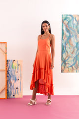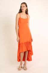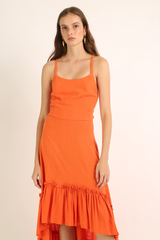 Vestido midi em tecido misto de linho com recorte na cintura, barrado franzido e assimétrico