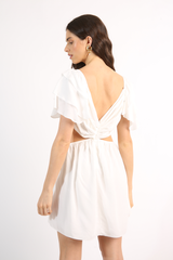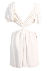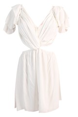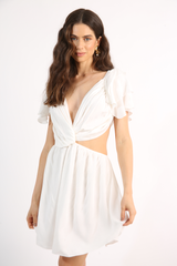 Vestido confeccionado em tecido de viscose maquinetada, mangas em camadas, decote torcido e recorte na cintura