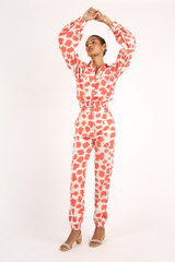 As pinceladas de característica única da designer, saem de suas telas, elaboradas em diversas camadas de tinta acrílica dentro de seu atelier. Essas pinceladas, posteriormente, se transformam em estampas exclusivas e atemporais a cada coleção, mantendo uma estética refinada e o processo de criação artsy na sua mais pura essência.