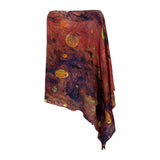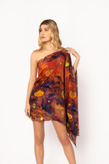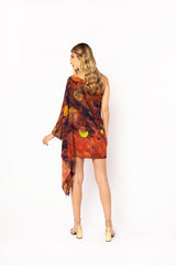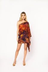 Kaftan curto estampado, confeccionado em seda com modelagem ampla e manga longa em um ombro só.