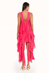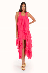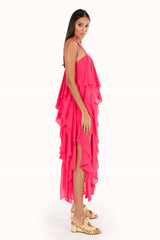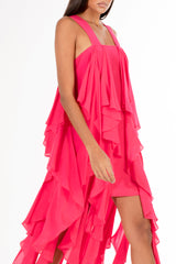 Vestido curto de alça larga, com detalhe de babados fluídos em comprimento midi e fechamento por zíper lateral.