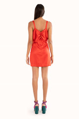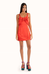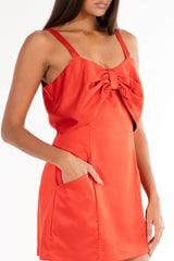 Vestido curto de alça com detalhe de laço no busto. Possui dois bolsos laterais e shape mais ajustado ao corpo.