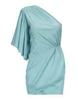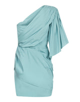 Vestido modelagem próxima ao corpo, um ombro só, confeccionado em tricoline de modal e detalhes drapeados no busto e na saia
