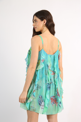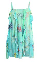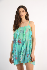 Vestido confeccionado em crepe georgete de viscose, decote reto, babados aplicados, alças finas e modelagem A.