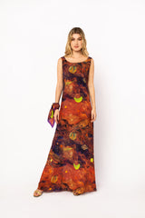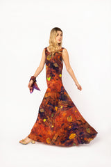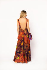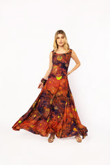 Vestido longo estampado, confeccionado em seda, com caimento fluido, saia ampla