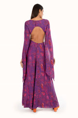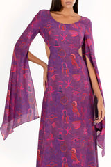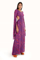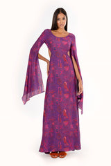 Vestido longo estampado com mangas super amplas. Aberturas laterais e fechamento com abotoamento nas costas e zíper. Peça toda forrada em tecido 100% Viscose.