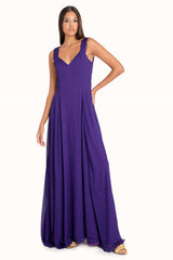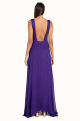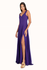 Vestido longo com fenda, feito em crepe georgete de viscose. Possui decote costas profundo e alça mais larga. Peça toda forrada e pode ser usado com a capa curta Nepthys.