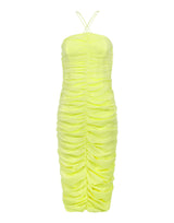 Vestido confeccionado em crepe georgete de viscose, forrado, drapeado, com alças removíveis.