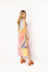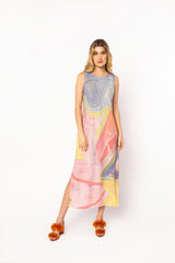 Vestido longo estampado, com decote canoa e fendas laterais.