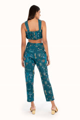 Cropped de alça em sarja estampada e acabamento de vivo. Possui franzido frente e costas, e fechamento com zíper de metal.